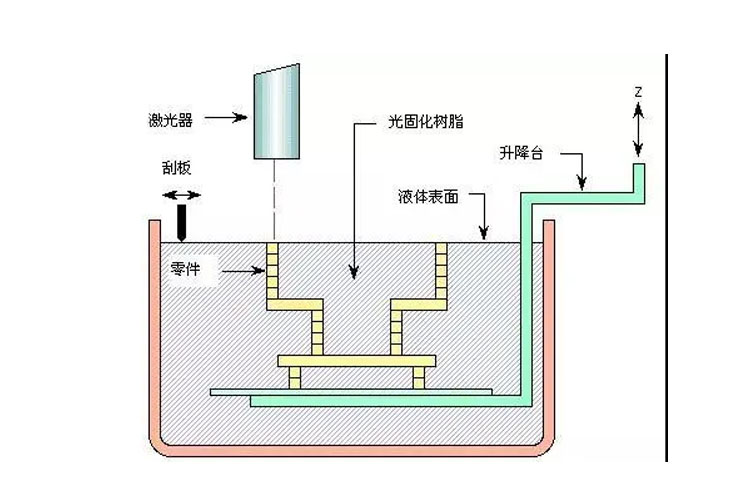 打印之前在樹脂槽中盛滿液態(tài)光敏樹脂,可升降工作臺(tái)處于液面下一個(gè)截面層厚的高度,聚焦后的激光束在計(jì)算機(jī)控制下沿液面進(jìn)行掃描,被掃描的區(qū)域樹脂固化,從而得到該截面的一層樹脂薄片;升降工作臺(tái)下降一個(gè)層厚距離,液體樹脂再次暴露在光線下,再次掃描固化,如此重復(fù),直到整個(gè)產(chǎn)品成型;升降臺(tái)升出液體樹脂表面,取出工件,進(jìn)行相關(guān)后處理,通過(guò)強(qiáng)光、電鍍、噴漆或著色等處理得到需要的最終產(chǎn)品。