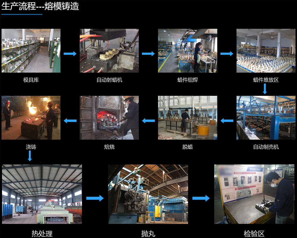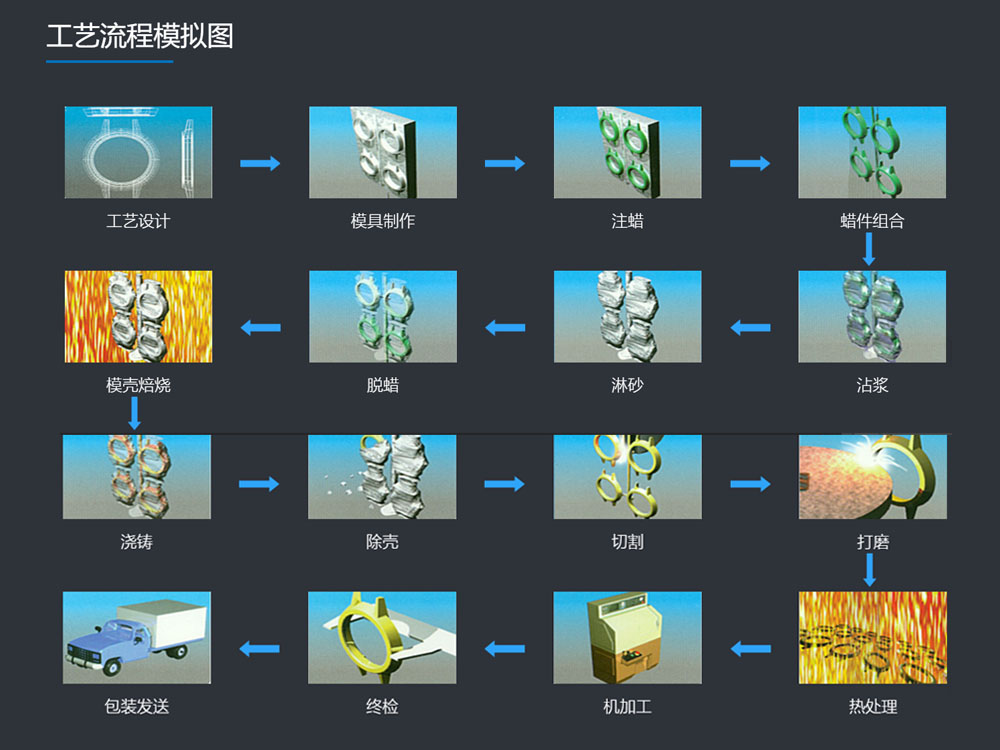 熔模鑄造工藝包括幾個步驟:金屬模具制造,蠟模生產,模殼制造,澆鑄,清砂切割, 打磨精整。